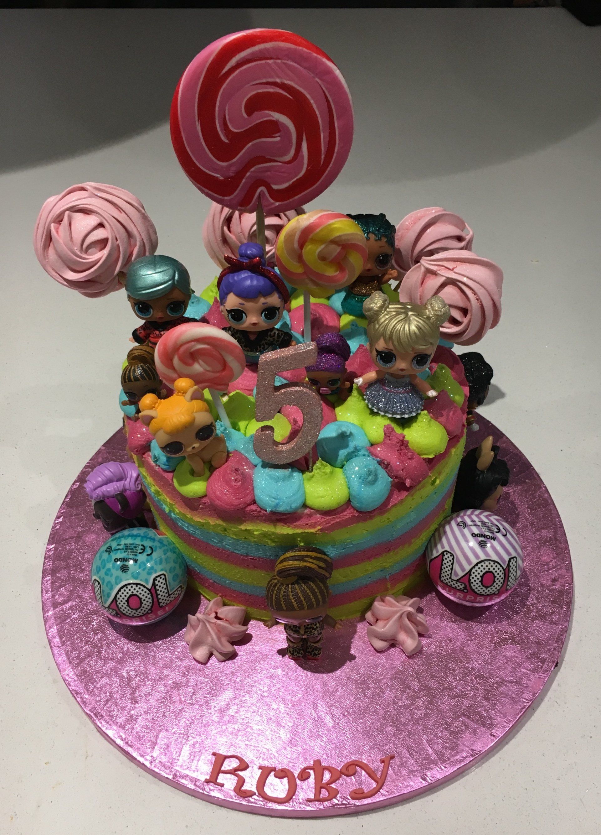 and was overjoyed with the LOL Dolls Cake designed and created by Amy, it is a three layered vanilla sponge with jam and buttercream separating the layers. The outside is covered in rainbow butter cream, decorated with meringues, lolly-pops, and LOL Dolls. This particular cake should provide approximately thirty slices and is 8 inches in diameter.