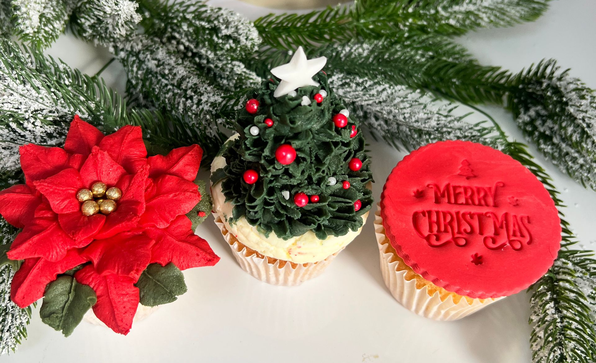 Vanilla cupcakes, hand-piped Poinsettia, Christmas Tree and Merry Christmas, Wreath. Gift boxed with a hand-tied ribbon.